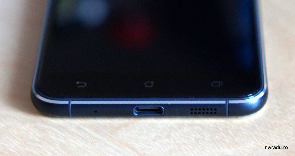 Partea frontală are butoane capacitive sub ecran. Partea din spate are modulul camerei plasat central și ieșit în relief, iar sub el se află cititorul de amprente. Asus a renunțat la butoanele amplasate pe spate, toate fiind acum în partea dreaptă. Jos avem portul USB tip C, cel reversibil, iar sus jack-ul audio. În partea stângă se află doar sertarul dual-SIM combinat cu cititorul microSD: prima zonă acceptă o cartelă SIM, a doua suportă SIM sau microSD, dar nu simultan.
