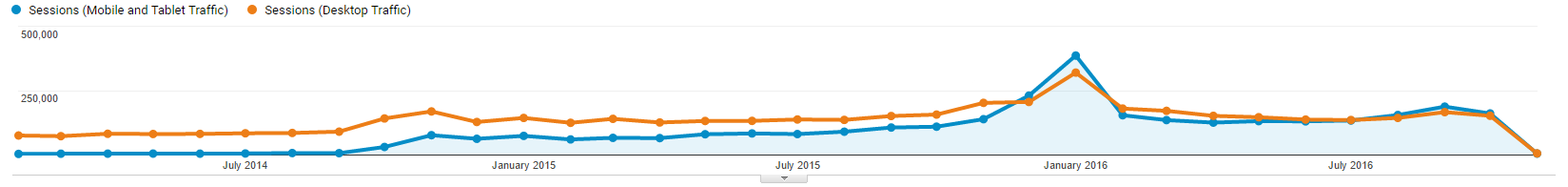 Iată și cum a evoluat totul în ultimii trei ani. Am date și mai vechi, dar tema aceasta este din ianuarie 2014 și în datele mai vechi n-am încredere, că foloseam un plugin pentru varianta mobilă și nu știu dacă Analytics a înțeles bine ce se întâmplă. Oricum, schimbarea este semnificativă în acești trei ani, deși vorbim de un site unde mereu au fost oameni ceva mai apropiați smartphone-urilor.