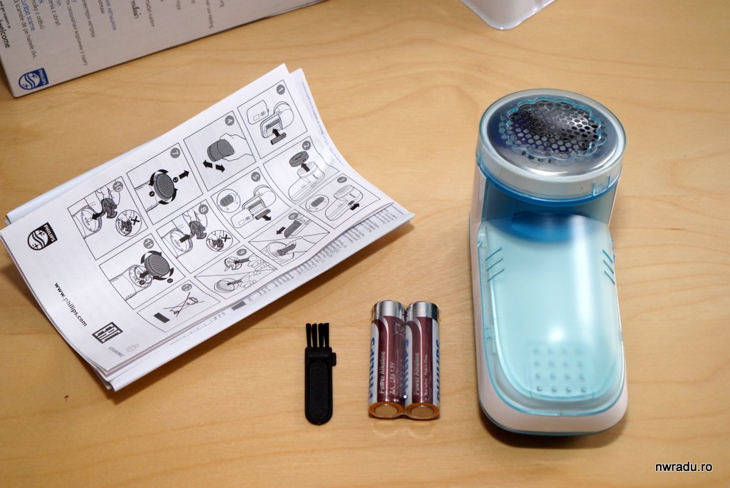 Aparatul este alimentat cu două baterii AA incluse în pachet. Tot inclusă este și o mică perie cu care să-l cureți din când în când, perie pe care cei de la Philips nu s-au gândit să o fixeze cumva sub capacul bateriilor sau în alt loc, așa că eu am lipit-o de aparat cu scotch.