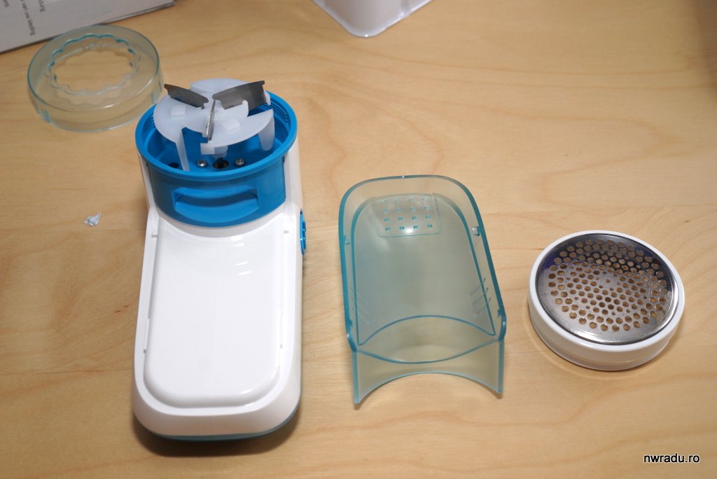 Pe partea din față se află un alt recipient detașabil în care se adună scamele tăiate. Din păcate, frecarea aparatului de diversele țesături îl încarcă electrostatic și multe scame vor rămâne lipite de capul argintiu. Nu contează, nu-i ceva deranjant că nu cad din senin de acolo.