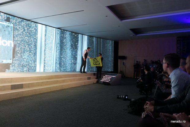 Ca și cum telefoane explozive n-ar fi fost suficiente, la începutul prezentării Samsung de ieri a intrat pe scenă un protestatar Greenpeace, cu un banner în mână, plecând după câteva momente.