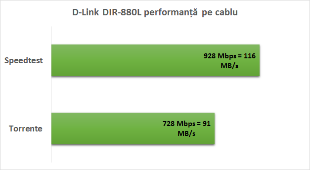 Dacă speedtest este un test simplu, aproape sintetic, testând performanța pe o singură conexiune, în cel de torrente testez capacitatea routerului de a gestiona zeci, poate sute de surse de la care trage părți mici din respectivele fișiere. Mai mult, eu măsor viteza medie de transfer, incluzând aici timpii ceva mai lenți de la început și final, obținând însă așa o imagine ceva mai bună într-un caz practic. Rezultatul obținut de DIR-880L mi se pare excelent.