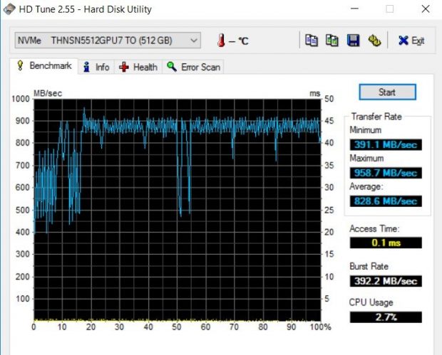 Stocarea internă de pe modelul testat a fost foarte performantă. În caz că nu știați, SATA 3 este limitat la un maxim de 600 MB/s, dar acest laptop avea un SSD conectat direct pe PCI-Express, un protocol mult mai nou și mai rapid. Rezultatele au fost “wow”, cu 828 MB/s rată medie de scriere într-un test, 938 MB/s în altul, dar când avem și o coadă de comenzi viteza maximă a ajuns la 1400 MB/s scriere și 1720 MB/s citire.