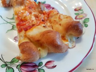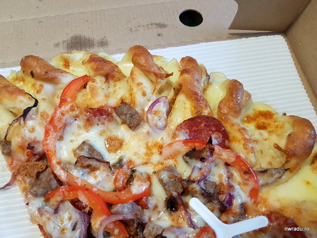 Pizza de la Pizza Hut cu blat Cheese Garlic Twist, adică marginea este umplută cu brânză și dată cu un pic de usturoi. Prea puțin usturoi, în opinia mea, că uneori nu-l simți deloc, dar scopul este atins, am mâncat cu plăcere și marginea pe care altfel aș fi lăsat-o nemâncată. Cam scumpă, însă, costă 6 lei în plus acest blat.