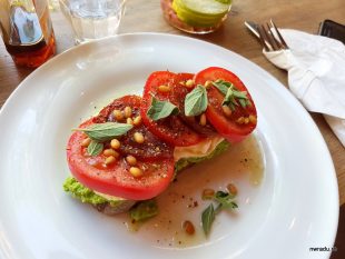 Am fost de multe ori la Frudisiac pentru mic-dejun sau “brunch”, iar preparatul meu preferat este cel din stânga, omletă cu somon pe o pâine neagră prăjită, împreună cu o salată rucola stropită cu un oțet balsamic foarte bun. În dreapta vedeți un toast cu burata, humus de mazăre, roșie și alte chestii; bună și aceea, dar e un preparat rece.
