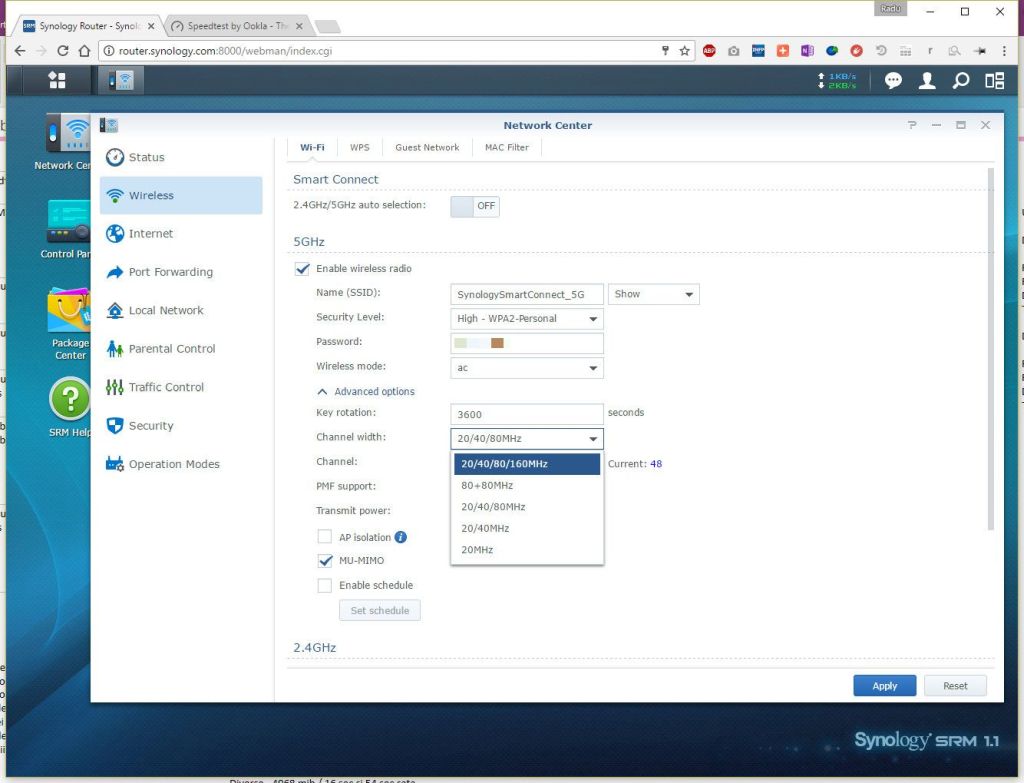 Vreau să precizez că, în mod default, routerul are activat un mod SmartConnect prin care dispozitivele văd o singură rețea wifi, acestea fiind repartizate de router pe banda cea mai bună pentru ele. De obicei nu am mare încredere în astfel de tehnologii, dar aici a funcționat perfect. Legătura s-a făcut din prima la 1733 Mbps și am obținut viteze foarte mari.
