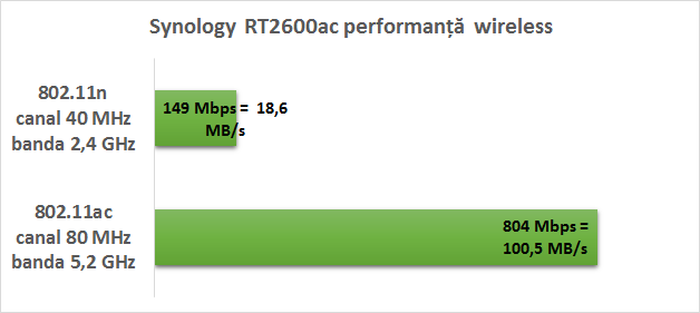 Acest rezultat a fost obținut pe 802.11ac, banda 5,2 GHz, canal de 80 MHz. Routerul poate și mai mult, poate crea canale de 160 MHz prin alăturarea a două canale de 80 MHz.