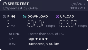 Pe wireless, routerul s-a comportat extraordinar de bine, cu o viteză maximă de 802 Mbps pe speedtest.net. Practic, am prins pe wifi aproape cât prind pe cablu.