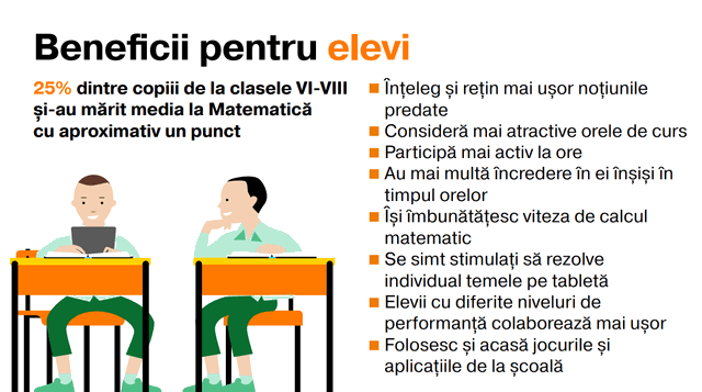 Un al doilea avantaj este că noțiunile predate sunt mai ușor de înțeles atunci când nu sunt doar desenate cu creta pe tablă, ci explicate prin animații și interactivitate pe tableta fiecărui elev sau proiectorul fiecărei clase. Matematica, în special, devine mai accesibilă în acest mod. Gândiți-vă doar prin câte culori și animații pot fi explicate fracțiile sau suprafața trunchiului de con.