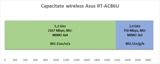 Trecând la wireless, routerul are o capacitate totală de 2900 Mbps formată din 2167+750 Mbps. Suportă beamforming (adică se prinde cam în ce direcție ar trebui să trimită semnalul spre dispozitivul tău) și multiple streamuri cu același dispozitiv.