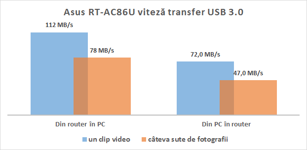 AC86 nu doar că este foarte rapid pe cablu și wireless, dar este și cel mai performant model pe transferul de pe USB 3.0. Spoiler de mai jos: citește de pe USB cu 110 MB/s, adică limita de 1 Gbps a conexiunii la router, cam de 2-3 ori mai rapid decât altele testate de mine.