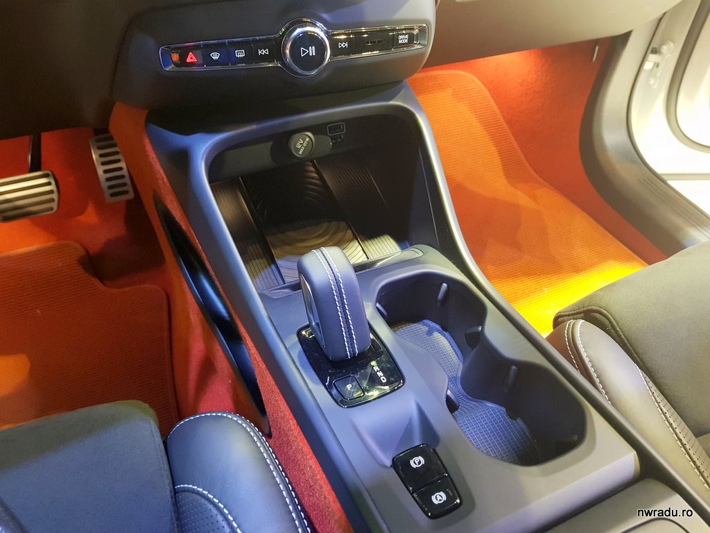 Chiar și așa, XC40 tot are un aspect premium, că totuși este o mașină ce începe de la 41.000 euro. Interiorul este finisat cu un model discret de-a lungul bordului, gurile de ventilație sunt spectaculoase, portbagajul este mare, bancheta din spate oferă spațiu generos. Versiunea R-Design expusă avea caroseria în două nuanțe și interiorul la fel, cu material roșu în portiere și pe jos. Versiunea Momentum avea caroseria într-un roșu “pasiune” și interiorul ceva mai discret.