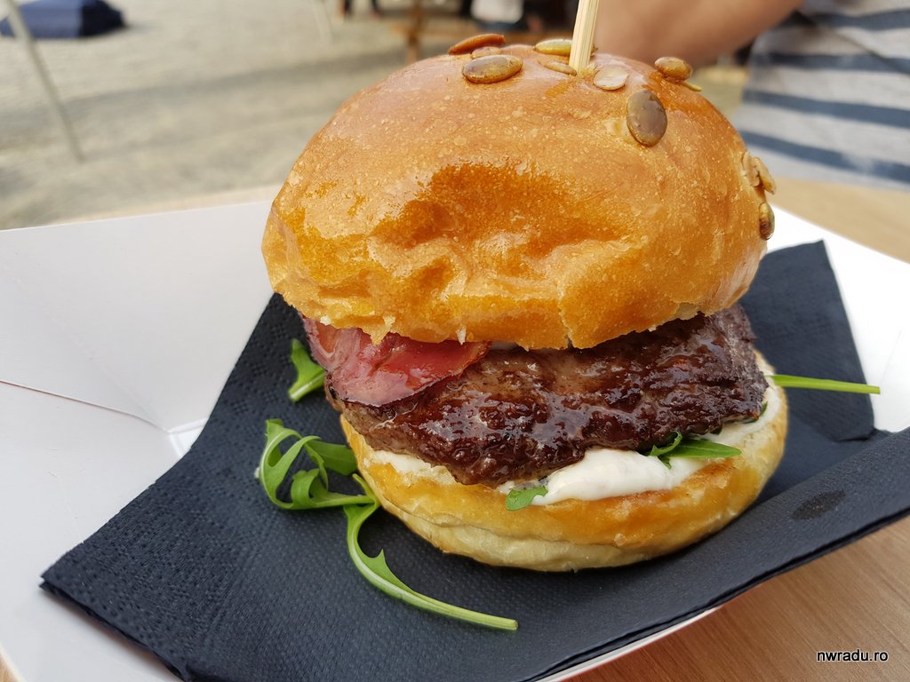 Farm Burger este destul de asemănător, dar are brânză de burduf și pancetta. Îl vedeți mai jos, uitați-vă cum lucește carnea! King Louis este singurul pe care l-am evitat după ce, când l-am mâncat acum vreun an, mi s-a părut că are prea mult gust de trufe și asta îl face uneori cam greu la stomac. De obicei mai vine pe la festivaluri și un burger numit BAO (vită, bacon, ouă de prepeliță, cheddar, rucola, ceapă prăjită), care-i bun, luați-l dacă-l vedeți în meniu. La restaurant este mereu.
