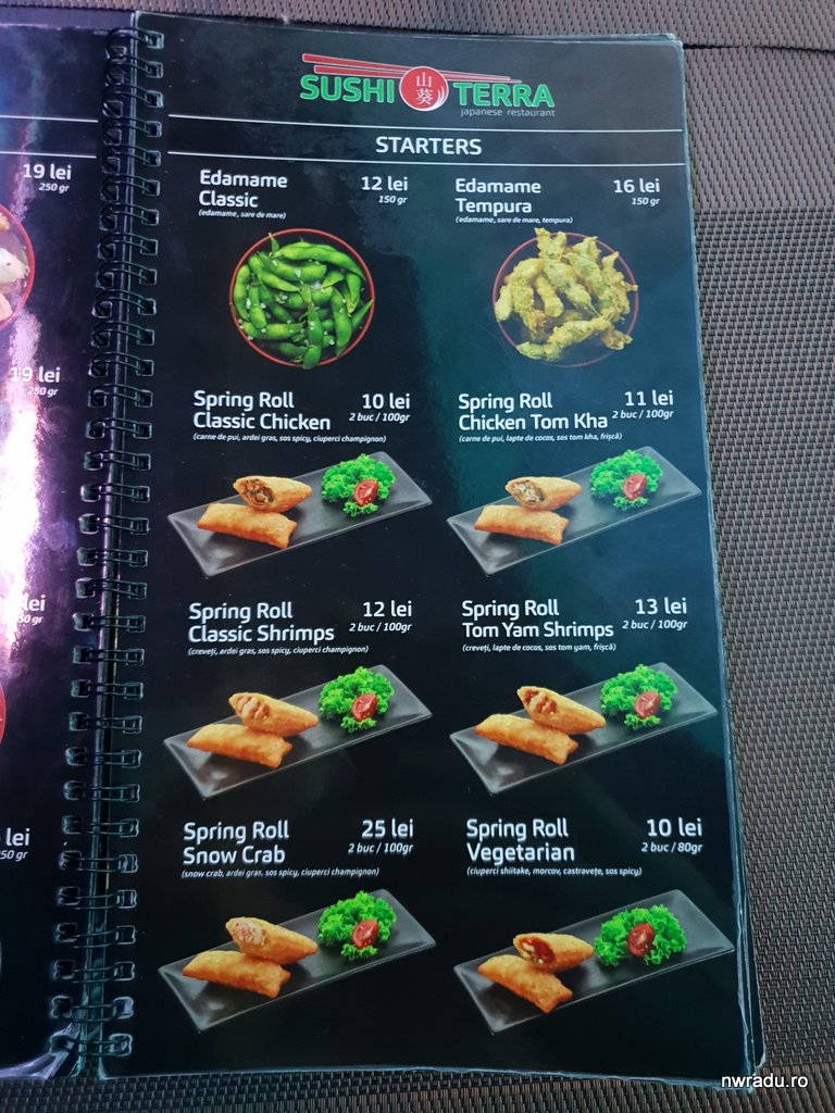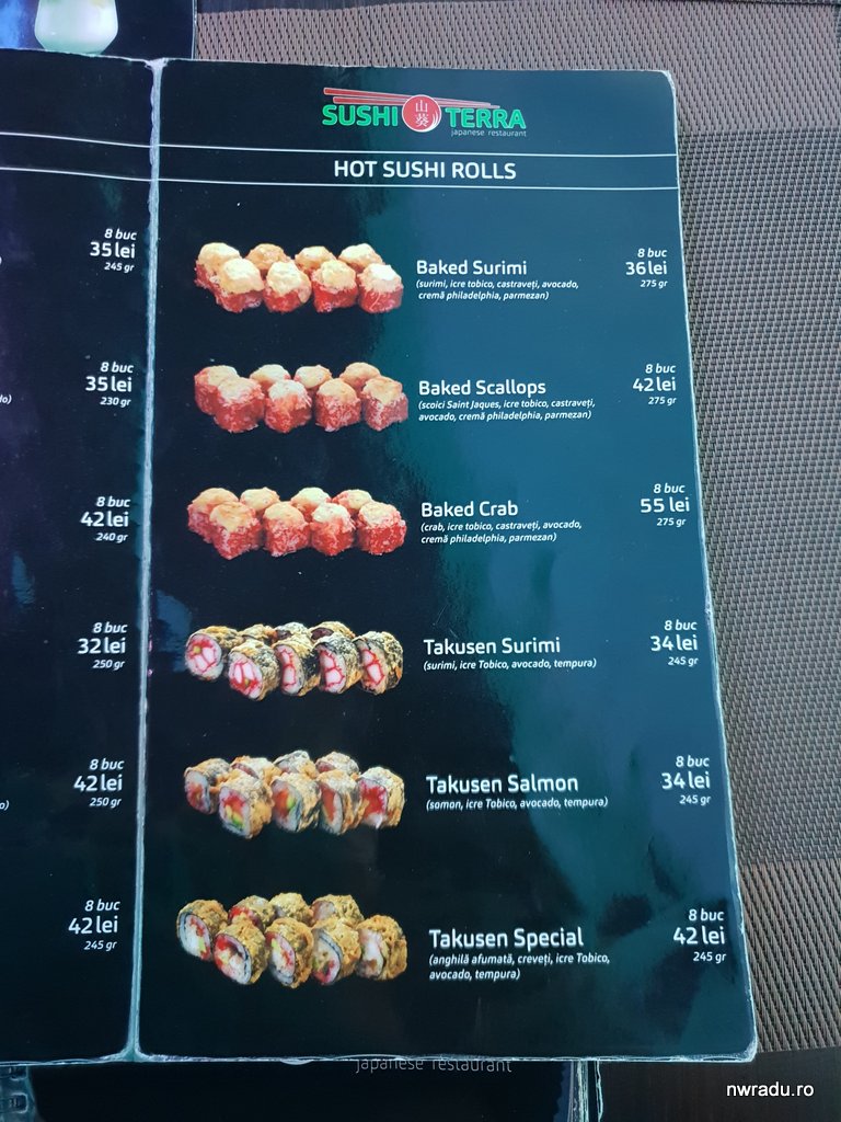 Sushi Terra se află pe Calea Dorobanți 140, destul de aproape de Piața Dorobanți. Mai au localuri și în Veranda Mall și în Promenada Mall, plus un punct de vânzare în Carrefour Băneasa, oferă și livrare. Orarul este L–D 11–23, site-ul oficial este sushi-terra.ro și găsiți acolo și meniul, au și pagină de Facebook. Cu parcarea e dificil în zonă, străduțele sunt pline, dar metroul Aviatorilor este la 15 minute de mers pe jos.