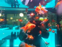 Mai mult, au câteva mese de două persoane dispuse pe lângă aceste acvarii și cred că asta le face printre cele mai frumoase locuri de luat masa din București. Restul meselor sunt separate cu plastice din care difuzează o lumină albastră, plăcută, creând pe total un aspect foarte modern.