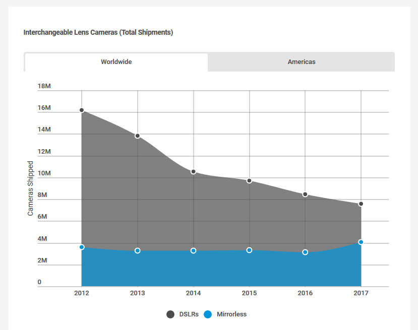Rapoarte recente spun că vânzările de aparate foto mirrorless au crescut constant, ba chiar într-un ritm mai alert în 2017, în timp ce vânzările de DSLR-uri scad constant de ani întregi.