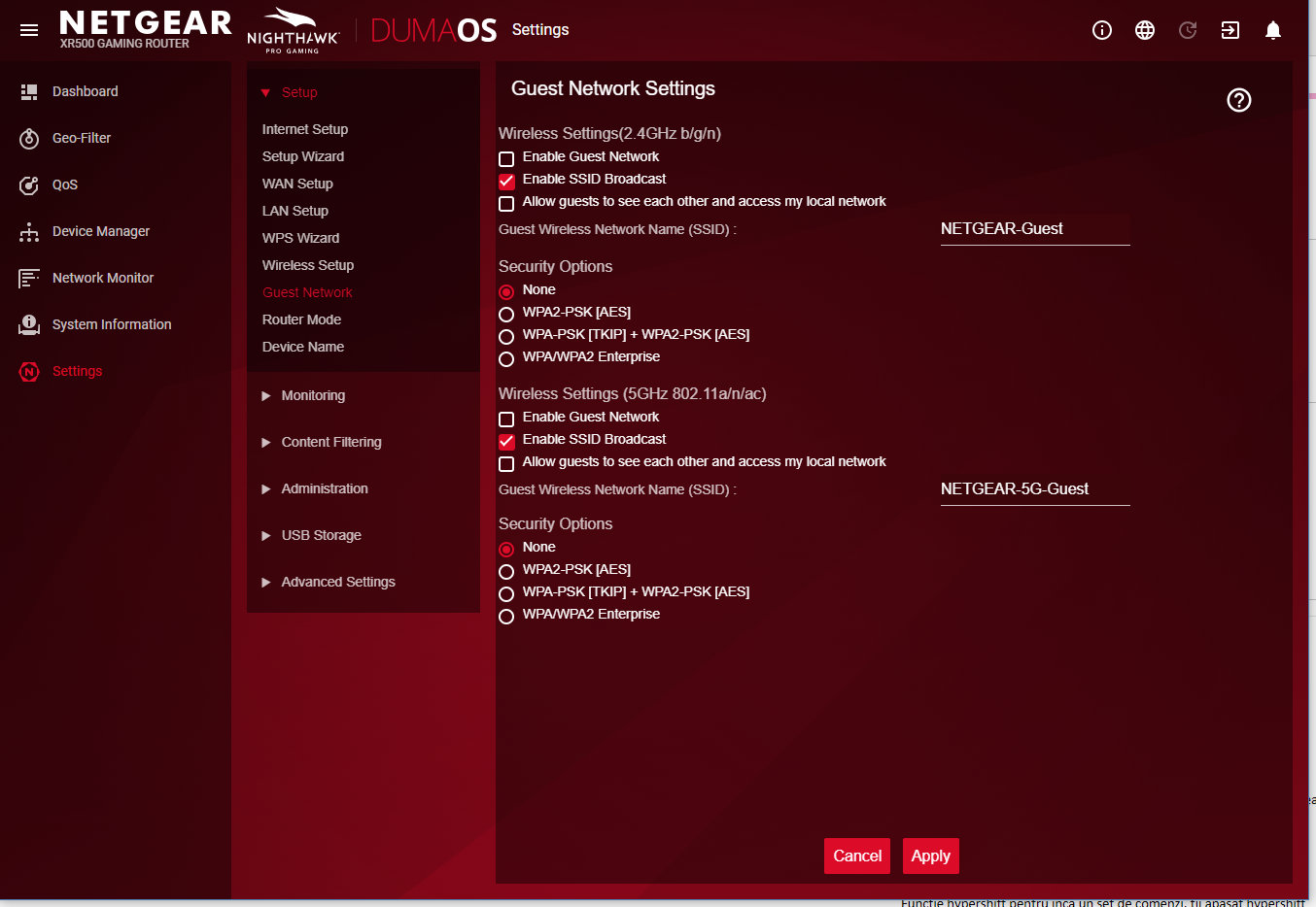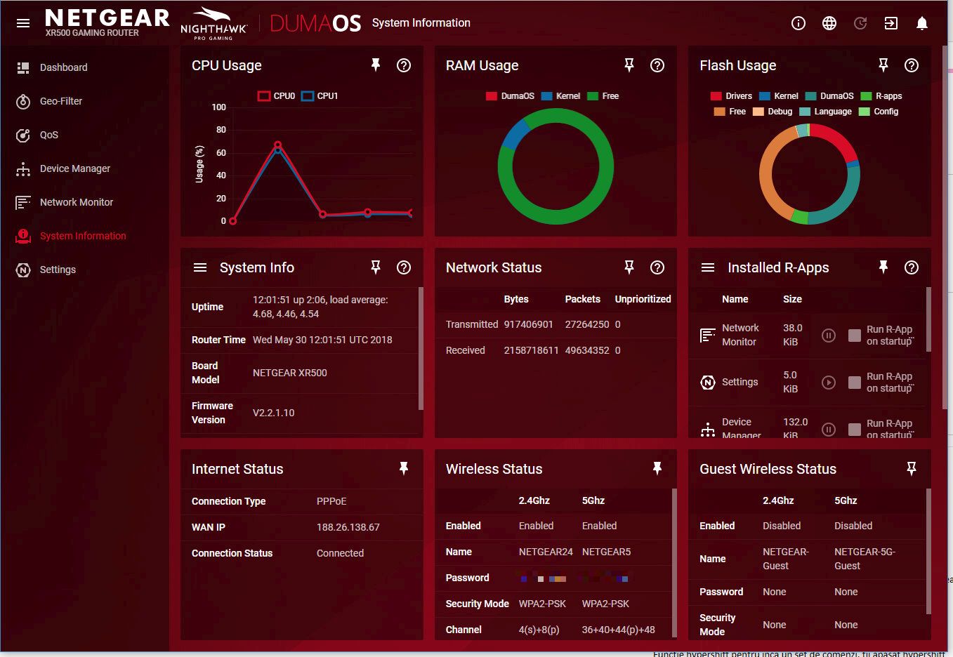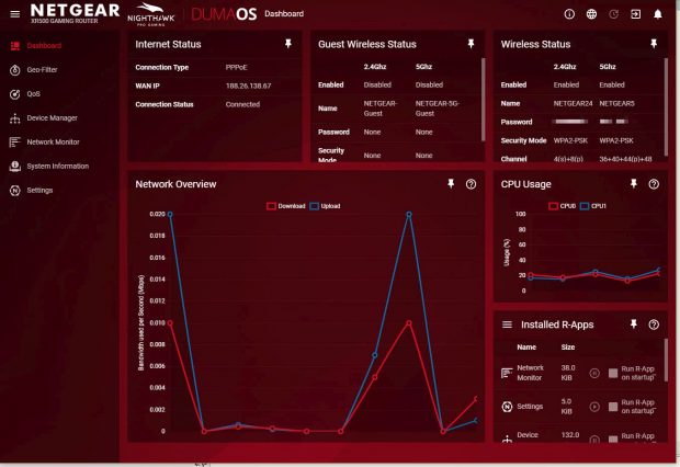 XR500 rulează ceva numit DumaOS, un firmware care arată bine, se mișcă rapid și aplică destul de rapid eventualele modificări de setări. Față de modelul Netgear X10 testat acum câteva luni, este un mare pas în față, iar DumaOS stă cu fruntea sus chiar și între alte interfețe ale altor producători.