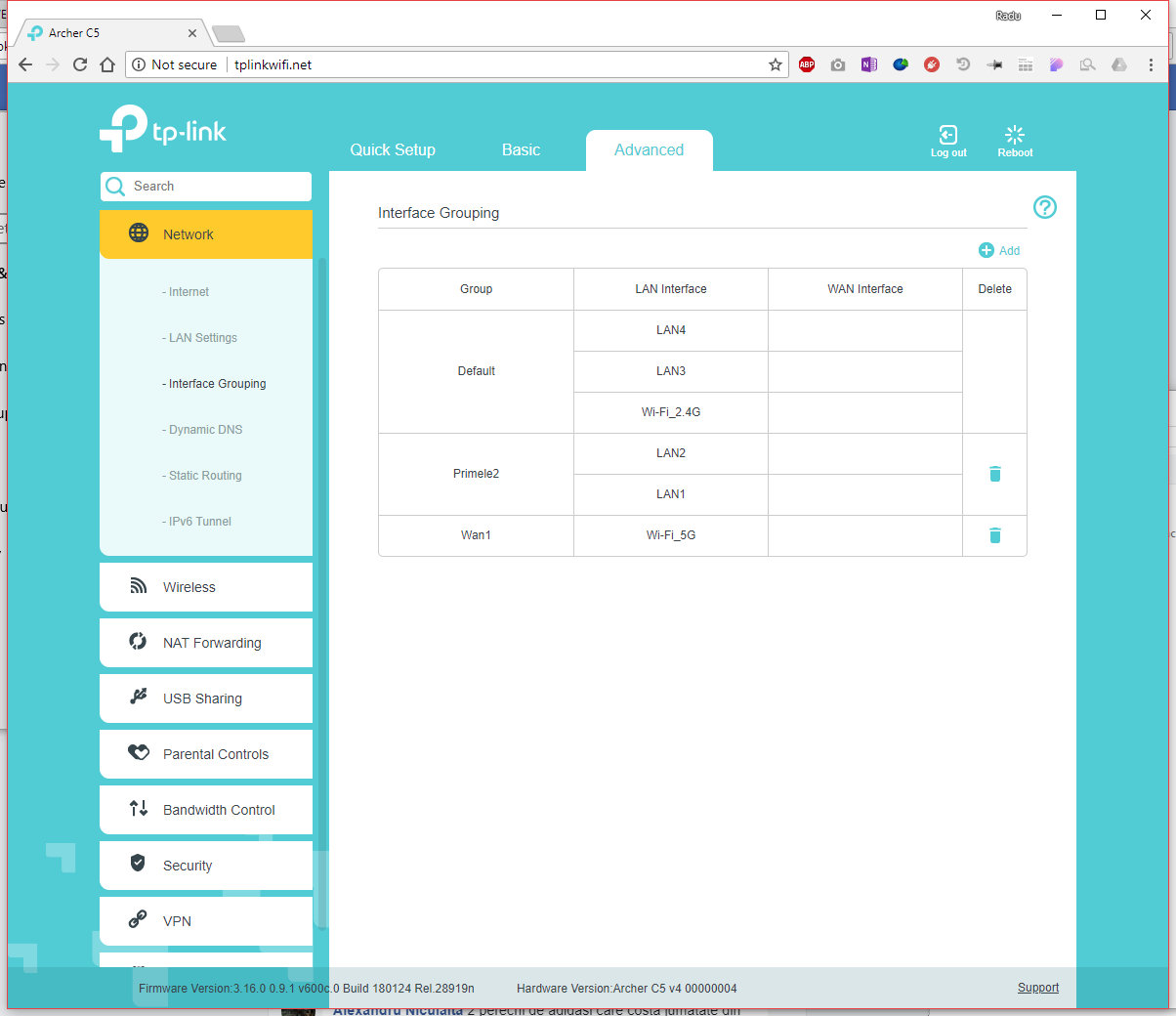 Interface grouping: poți grupa după cum vrei tu diversele porturi LAN și rețele wifi astfel încât să obții o separare a rețelelor. În mod normal bănuiesc ar fi trebui să poți aloca și conexiunea WAN în ce grupuri vrei tu, astfel încât anumite porturi să nu aibă acces la Internet, dar eu n-am reușit să fac asta. Oricum, opțiunea e interesantă dacă vrei o securizare mai adâncă a unor elemente din rețea, de exemplu să conectezi un NAS pe portul LAN 4 și acesta să poată fi accesat doar de dispozitivele conectate la wifi-ul de 2,4 GHz sau de cele conectate pe LAN 3, dacă așa faci grupele.