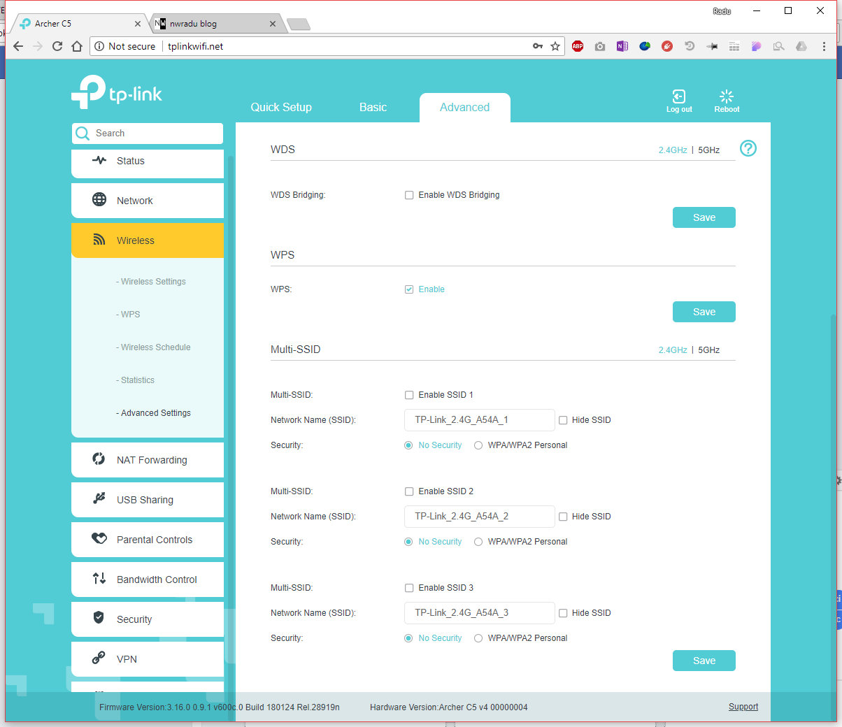 Multi-SSID: Archer C5 poate genera rețele guest, dar nu le numește astfel. Poate, în schimb, să genereze 3 rețele diferite pe 2,4 GHz și 3 rețele diferite pe 5 GHz, la toate putând securiza sau nu conexiunea prin parolă. Rețelele guest au de obicei o izolare automată de rețeaua LAN, dar se poate și aici obține același lucru prin setările Interface grouping.