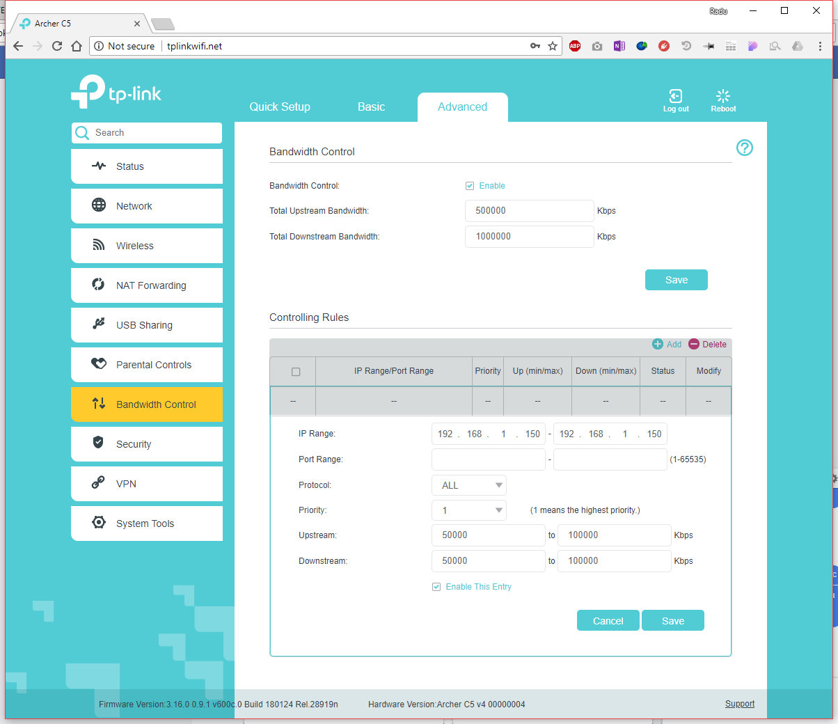 Bandwidth control: este un fel de QoS ce trebuie reglat manual per IP. Să zicem că, indiferent ce fac PC-urile în rețea, vrei să rezervi bandă pentru smart TV, ca să meargă Netflix fără probleme chiar și când copiii se joacă ceva pe calculator sau fac download cu viteză mare. Trebuie să iei IP-ul televizorului și să-i aloci o bandă minimă și una maximă de download și upload, ceea ce rezolvă problema. Există și câteva niveluri de prioritate, 1–5, astfel încât routerul să poată gestiona mai multe astfel de setări în același timp.