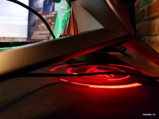 Monitorul mai vine cu câteva șmecherii exterioare. Piciorul proiectează o lumină pe masă, sub el, iar sigla de acolo poate fi înlocuită cu alta (primești un plastic pe care poți lipi ce autocolant vrei tu pentru a “desena” altceva). Același picior proiectează acum și sigla ROG în sus, pe un perete dacă monitorul este plasat lângă unul, ca să se vadă de la o poștă că ai un model special.