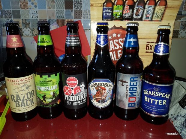 6 beri britanice, mai rar întâlnite prin magazinele noastre, din care vreo 3 sau 4 sunt de tip amber ale. 40 de lei, un pic cam scump, dar îmi place să încerc măcar o dată diverse băuturi. Doar Hobgoblin mai băusem de acolo.