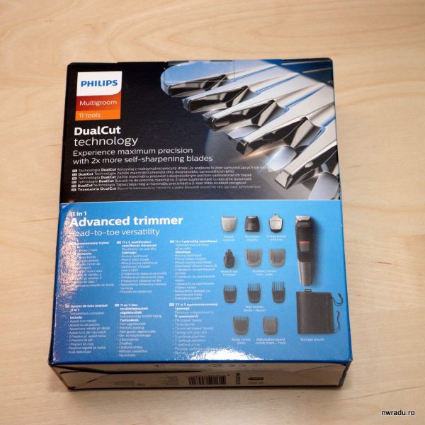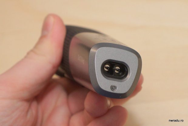 Trimmerul principal este aproape în întregime metalic, ceea ce mi-a plăcut, că pare mai solid. Philips spune și de o tehnologie cu două lame de tăiere ce se ating ușor una pe alta în timpul utilizării, astfel încât stau mereu ascuțite. Așa o fi.