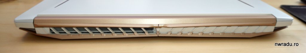 Mai important este că această carcasă de pe Helios 300 include părți metalice, capacul ecranului și baza superioară fiind metalice, un bonus plăcut. Sigla Predator se află la loc de cinste pe capac, la fel și cele două dungi caracteristice. Același auriu, să-i zicem, se găsește și pe muchia din spate a laptopului, unde gurile de ventilație asimetrice m-au deranjat un pic vizual, dar nu cât să-mi pese, și pe tastele WASD ale tastaturii.