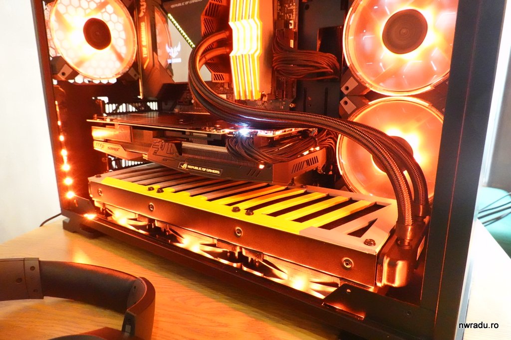 Iată și fotografii cu un sistem făcut de Asus din componente TUF, că există și gama TUF de componente hardware. Are un GTX 2070 în interior, placă de bază TUF Z390-ProGaming, procesor Core i7-9700K și sursă ROG Thor. Coolerul de pe procesor este un ROG Ryujin 360 de 1.400 lei, are și un mic ecran OLED pe el unde este afișată acum sigla TUF.