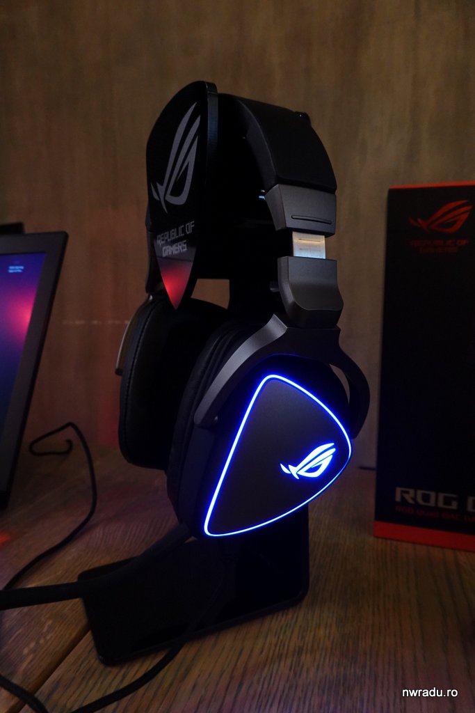 ROG Delta sunt noile căști de top de la Asus și le-au ieșit bine de tot. Arată bine de tot cu acea formă triunghiulară (de unde și numele Delta, bănuiesc) a cupelor, iar iluminatul Aura le-a ieșit foarte bine, îmbinările cu LED-urile multicolore ale acelui contur luminos sunt foarte reușite.