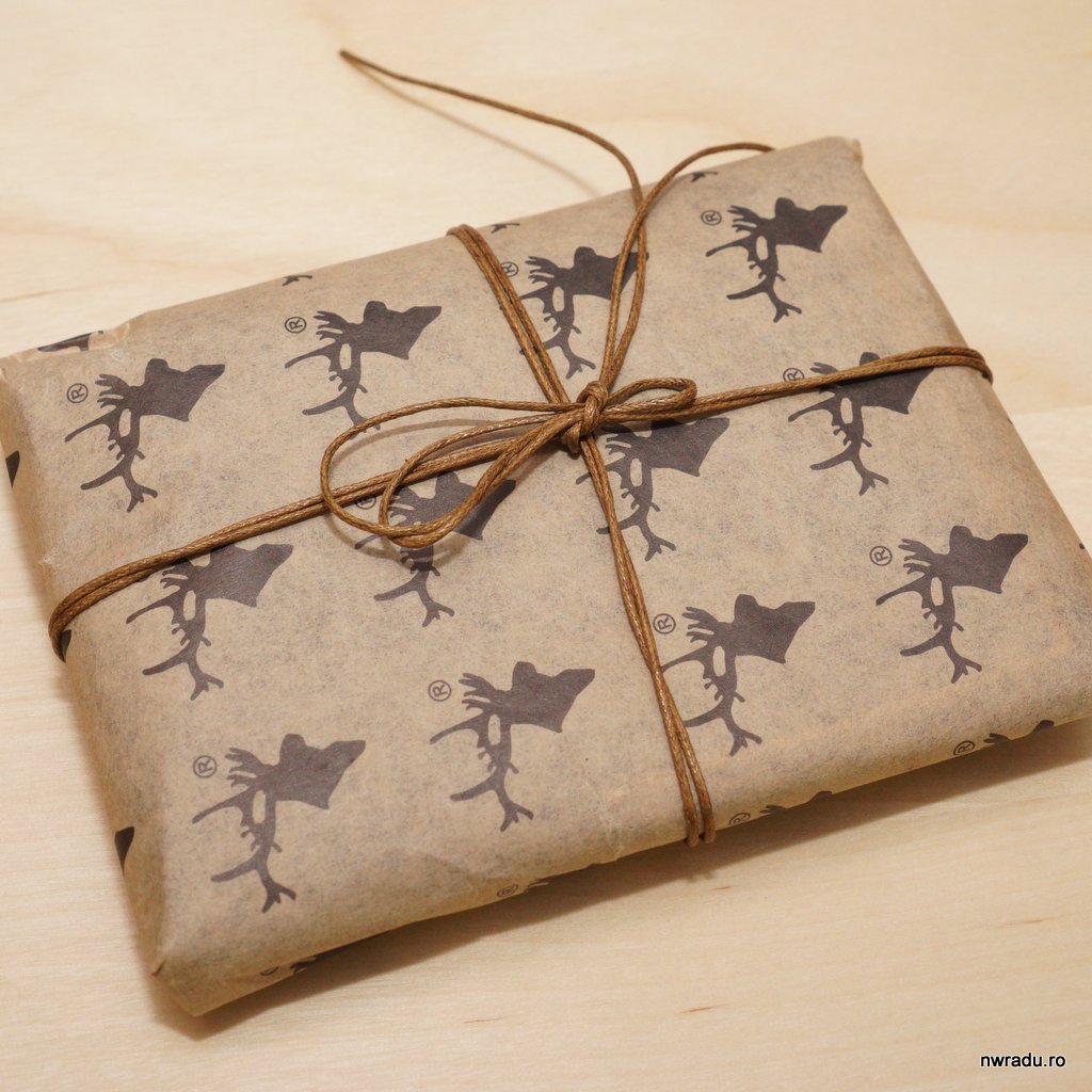 L-am primit ambalat de mână, în hârtie cu logo-ul firmei și legat cu fundă.