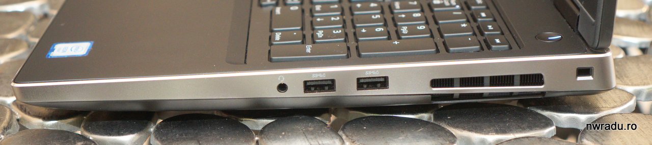 Dell Precision 7530 stă bine și la conectivitate. Nu doar că ai ieșire video prin HDMI și miniDisplayPort, dar include și două porturi Thunderbolt 3, ca orice laptop premium. Banda lor este mult mai mare, de fapt Dell spune că ar putea fi utilizate pentru a conecta un monitor 8K. Ca idee, asta înseamnă 7680×4320 x 8 x 3 x 60 = 47 Gbps bandă disponibilă prin port. Pentru transfer de fișiere cu dispozitive compatibile, așteptați-vă la viteze de peste 2800 MB/s.