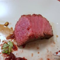 Iată un mușchiuleț de vită (fillet mignon cum ar zice alții) făcut sous vide la 54,5 grade timp de o oră, apoi searing în tigaie. Observați că a ieșit de un roz uniform în întreaga sa masă, exact cum primești uneori la restaurante, deși bucata este foarte groasă. Sare Maldon pe deasupra, mâncat cu hrean.