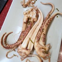 Tentacule de calamar, cumpărate din Kaufland, făcute vreo 4-5 ore la sous vide și apoi trase în tigaie pentru culoare. Am pus în pungă ierburi și zeamă de lămâie. Au ieșit moi și bune, dar mai trebuie umblat la rețetă și trebuie să încerc cu caracatiță.