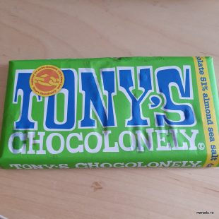 Ciocolată olandeză Tony’s, din Mega Image. Am luat-o pe cea cu ciocolată neagră, sărată și cu migdale. Bună, dar foarte intensă la gust.