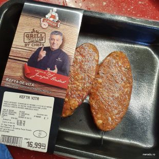 Kefta Le Boucher din Mega Image. Kefta este un amestec de carne și condimente mediteraneene. Acestea în particular sunt gustoase, o bucată, hai una jumătate, sunt suficiente pentru o porție normală, iar eu le-am gătit câteva minute în tigaie și le-am servit cu un ou moale pus deasupra fiecăreia și cu salată cus-cus.