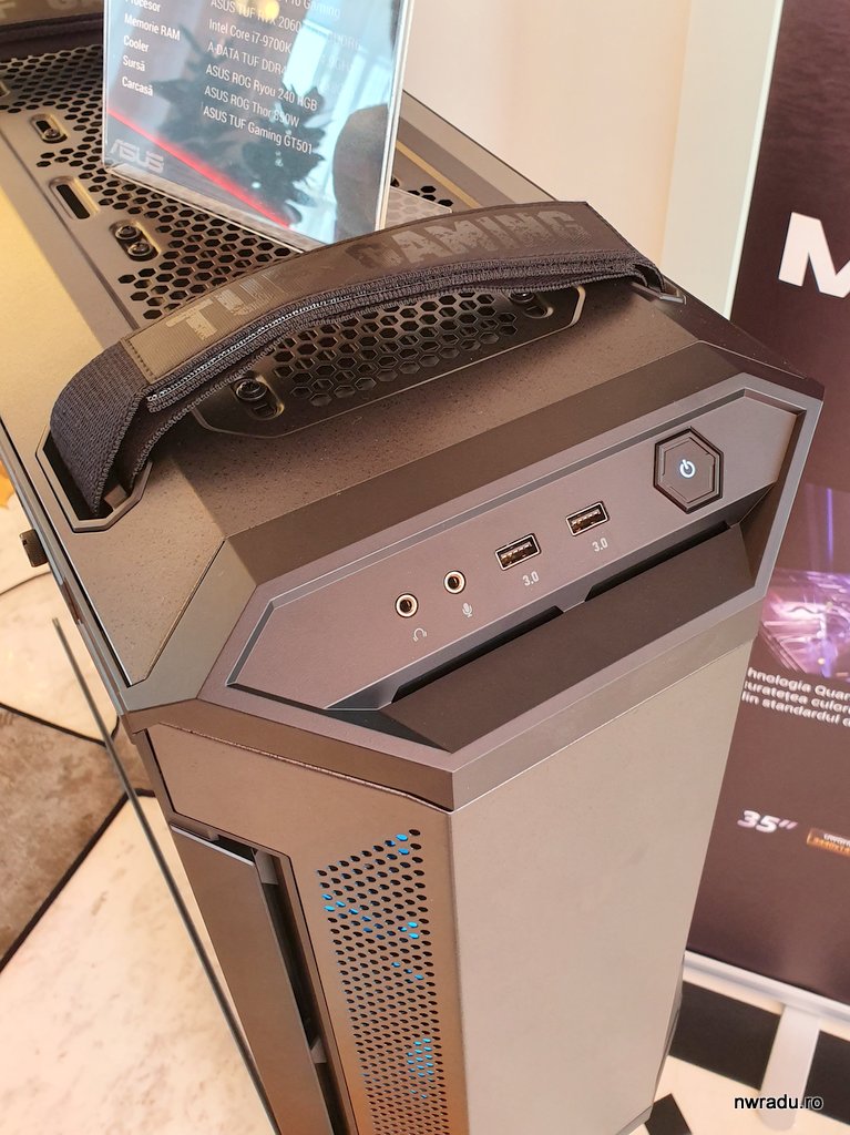 Cea de mai jos este modelul TUF Gaming GT501VC. Oțel inclusiv în partea din față, sticlă doar pe o parte, aspect ceva mai serios, iluminare indirectă prin fante frontale, pregătită pentru un management bun al cablurilor, poate suporta și răcire cu apă. Are filtre de praf cu prindere magnetică pentru a fi ușor scoase și spălate.