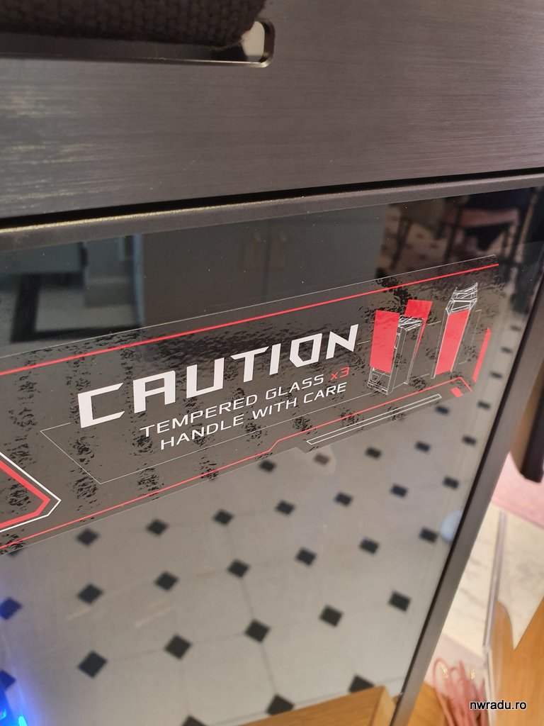 Șasiul este din aluminiu, include iluminare ROG pentru partea din față, are loc pentru răcire cu apă. Sursa este în partea de jos, iar în restul carcasei rămâne loc chiar și pentru trei plăci video sau două montate vertical (ca să se vadă mai bine) cu ajutorul unor adaptoare incluse în carcasă.