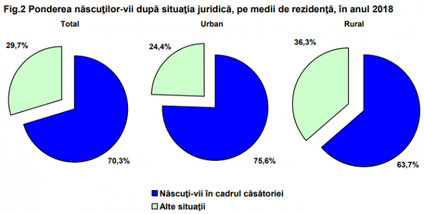 70% dintre copii se nasc în cadrul unei căsătorii. Aici… nu intuiam această statistică. Adică am destui prieteni care au făcut copii fără a se căsători, deși majoritatea sunt în relații de durată cu partenerul/partenera, dar dacă ar fi fost să ghicesc, aș fi zic că e mai degrabă spre 80% statistica de mai sus. În mediul rural, cifra este chiar de 63,7%, după cum vedeți.