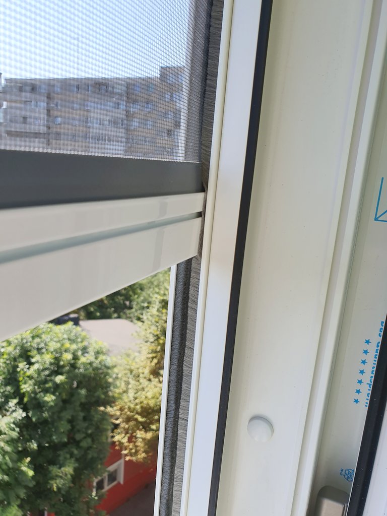 Plasa de țânțari îmi place mult. Este o rolă montată într-o casetă în partea de sus a ferestrei (nu se văd), iar pânza se trage de acolo pe două șine și se ancorează în partea de jos cu două cleme. Arată și funcționează mult mai bine decât credeam, în sensul că nu rămâne loc pe lângă ele, de-a lungul șinelor, și nici nu flutură în vânt sau ceva așa. Prinderea pare suficient de bună încât acum pot lăsa și pisicile în balcon, când plasele sunt coborâte, cu încredere că pisicile nu vor sări prin plase dacă văd vreun porumbel sau alt păsăroi.