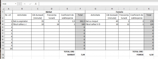 Promiteam și un tabel Excel cu asta; îl puteți descărca de aici. Am pus zece rânduri pentru fiecare persoană, dar probabil am exagerat la femei, care nu fac de obicei așa multe prin casă. Dacă aveți nevoie de mai multe rânduri, adăugați cu insert rows. Există și o formatare condițională pe totalul total, se colorează dacă diferență este mai mare de 3 ore între persoane, așa că nu umblați acolo.