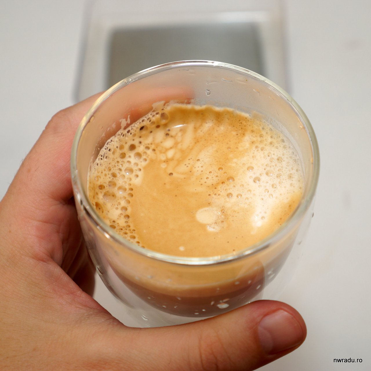 Încălzirea întregului sistem este rapidă, durează maxim un minut să fie gata. Presiunea pompei este suficientă pentru a extrage un espresso clasic. Crema acestuia este consistentă, deși chiar și acest aspect depinde uneori de tipul cafelei folosite. Puteți regla și tăria cafelei pe o scară de la 1 la 5. Am testat asta doar cu espresso și da, se simte imediat diferența, 1 fiind o băutură mult mai “diluată” decât 5, deși cantitatea din cană este aceeași.