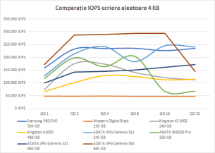 În citire și scriere secvențială depășește tot ce-am testat, indiferent de queue depth-ul folosit.