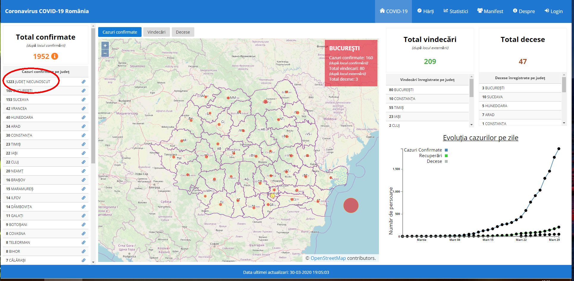 Trecem la România. O hartă asemănătoare făcută de Institutul Național de Sănătate Publică nu prezintă numărul de cazuri pentru fiecare județ, ci doar totalul pe țară. Covid19.geo-spatial.org prezintă situația per județe așa cum era acum vreo săptămână. În colțul din stânga sus scrie mare “1223 județ necunoscut” pentru că de atâtea cazuri statul român n-a mai anunțat situația geografică. (Update: între timp, au anunțat mai multe date despre Suceava, așa că acum sunt doar vreo 800 de “județ necunoscut”)