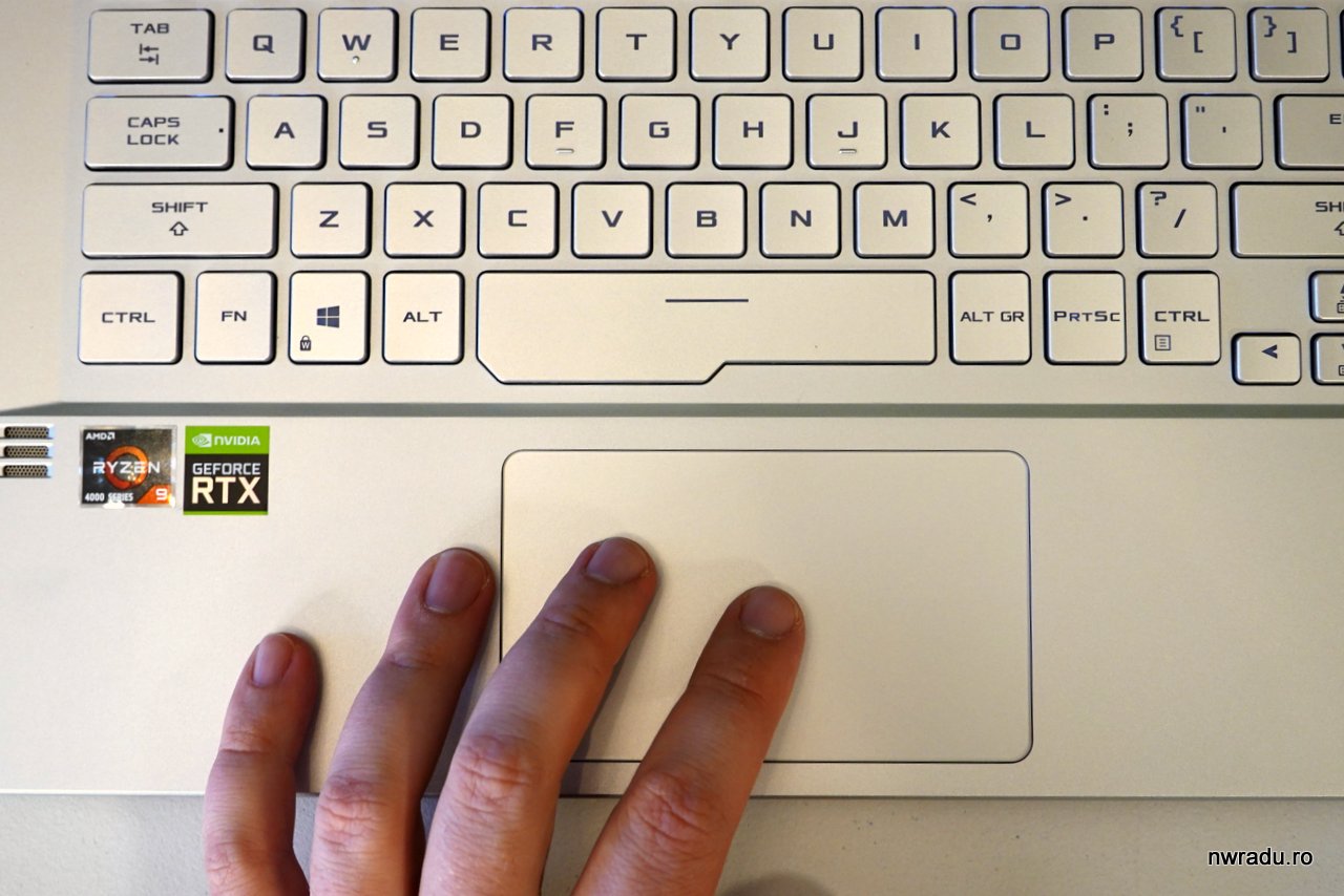 Trackpad-ul este și el mai bine realizat decât pe multe alte laptopuri Asus. Nu flencăne, nu flambează la apăsare, este precis în detecție și are o suprafață mică, astfel încât nu riști să-l apeși din greșeală cu palma (algoritmii software care ar trebui să detecteze asta merg de obicei prost). E un laptop de gaming, nu ai nevoie de touchpad mare pentru că cel mai probabil vei folosi un mouse.