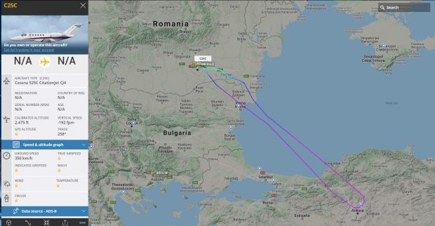 M-am nimeri ieri pe Flightradar24 fix când acest Cessna ateriza pe Băneasa. A avut traseul de mai jos: a decolat de pe Băneasa, a zburat până la Ankara, dar fără a ateriza, și s-a întors pe Băneasa.