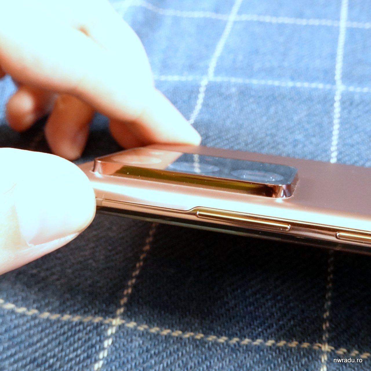 “Plita” camerelor foto este foarte ieșită în relief, cred că sunt 2-3 milimetri acolo în bump. Mă așteptam la asta, S20 Ultra are un design similar din cauza camerei periscopice și poate și a senzorului mai mare din cea normală, dar tot este un pic șocantă atunci când o vezi prima oară.
