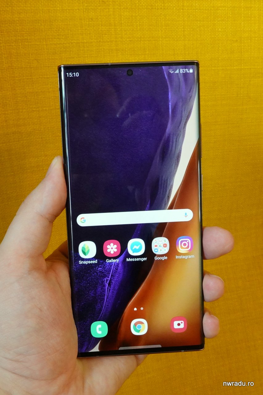 Ecranul are rezoluția maximă de 1.440 x 3.088 pixeli, dar funcționează la 60 Hz în acest mod. Note20 Ultra oricum vine configurat pe o rezoluție 1.080 x 2.316 pixeli în care totul arată oricum foarte finuț desenat, iar refresh-ul este aici variabil până la un maxim de 120 Hz.