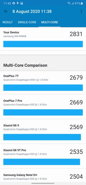 Chipset-ul este un Exynos 990 pentru majoritatea piețelor, inclusiv a noastră, și vine la pachet cu modem 5G (NSA și SA, Sub6 și mmWave). Există și o variantă de Note20 Ultra 4G, dar nu cred că va fi adusă în România. Rezultatele sunt bune, în benchmark-uri a fost semnificativ peste Snapdragon 855+ și trebuie să așteptăm review-urile unor versiuni americane pentru a-l compara cu Snapdragon 865. Modelul testat de mine a avut 12 GB RAM și 256 GB stocare internă.