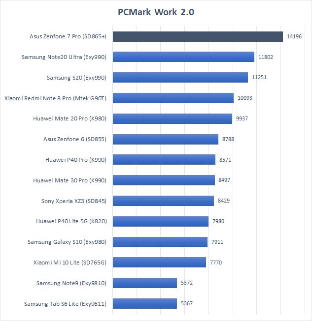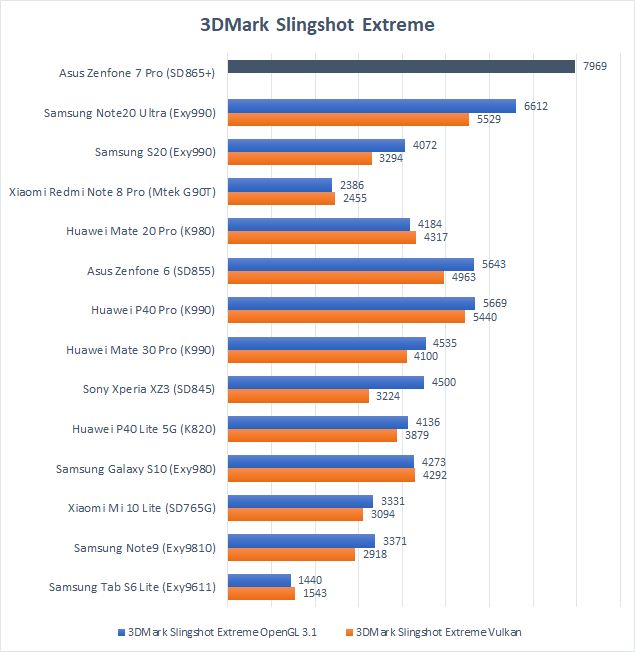 Chipsetul pe Zenfone 7 Pro este un Snapdragon 865+ (pe Zenfone 7 ai “doar” Snapdragon 865) și rezultatele în teste sunt extraordinare. Le-am pus într-un grafic alături de alte telefoane testate de mine în ultimul an, că așa sunt și mai relevante. Modelul testat de mine a avut 8 GB RAM și 256 GB stocare internă de tipul UFS 3.1, care poate fi extinsă cu microSD.